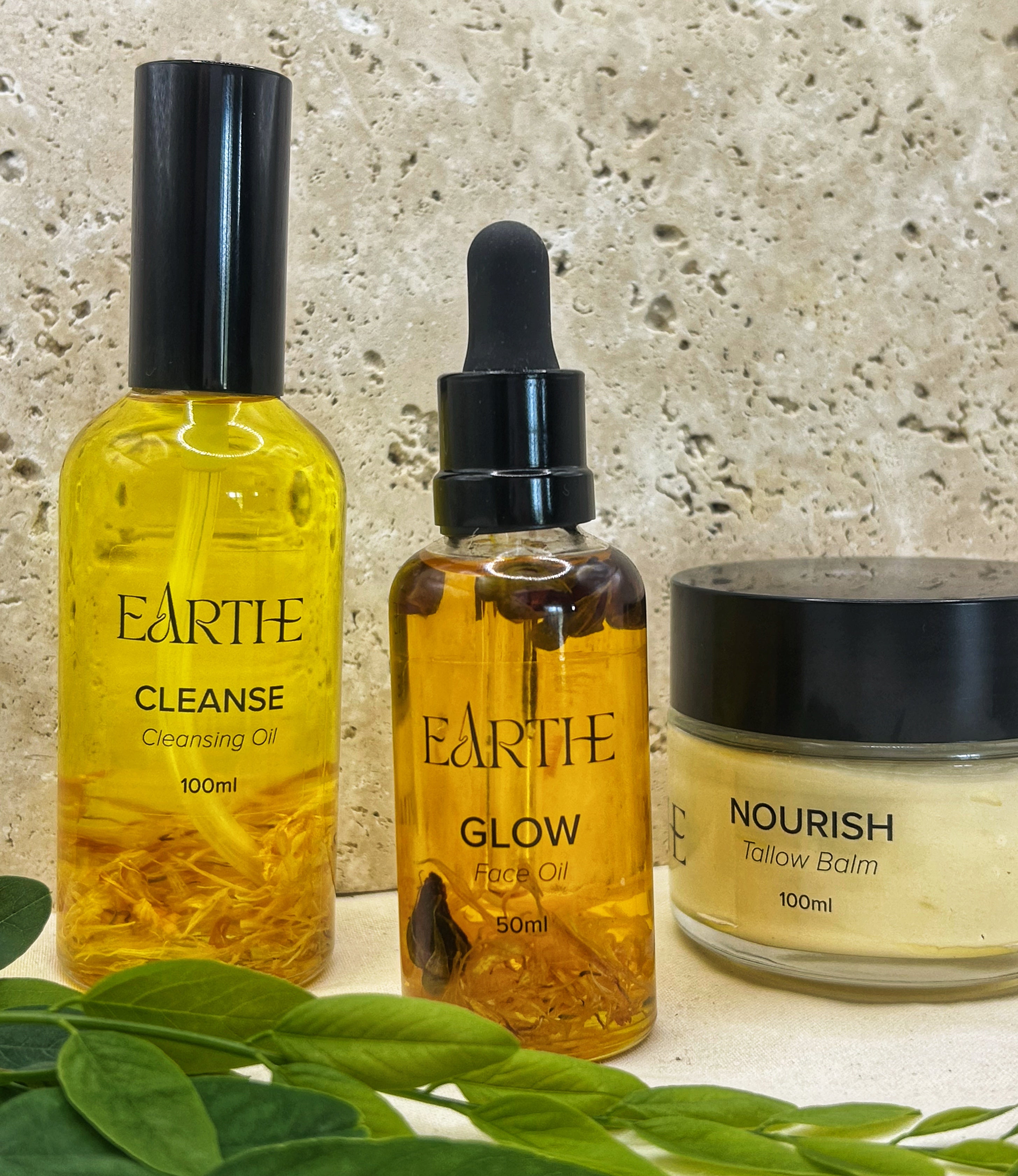 The Cleanse Oil-to-Milk Cleanser melts away impurities without stripping essential moisture. The Glow Botanical Face Oil, enriched with Bakuchiol (nature’s retinol), Seabuckthorn, Neroli, and Vitamin E, restores elasticity and brightness while helping reduce fine lines. Complete your ritual with your choice of either the Soothe Aloe Moisturiser for lightweight hydration or the Nourish Whipped Tallow Balm for deep overnight repair.